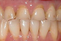 Before: Patient needs Upper Arch Rehabilitation. Presents with Upper Anterior teeth that are stained, incisal edges (tooth edge) are worn down and chipped, and gumline recession is present.