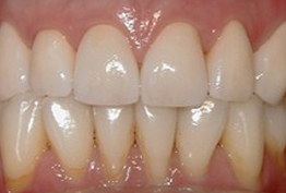 After: Smile restored with placement of 8 Upper All Porcelain Crowns (Caps). Gumline and incisal edges are now uniform. Patient now has longer, better shaped teeth to enhance the smile line and aid in chewing/biting function.
