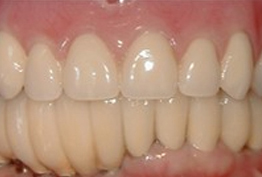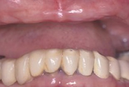 After: Great smile, chewing function, and facial tissue support possible with an Upper Denture that is supported with Implants and Lower Implants and Crowns